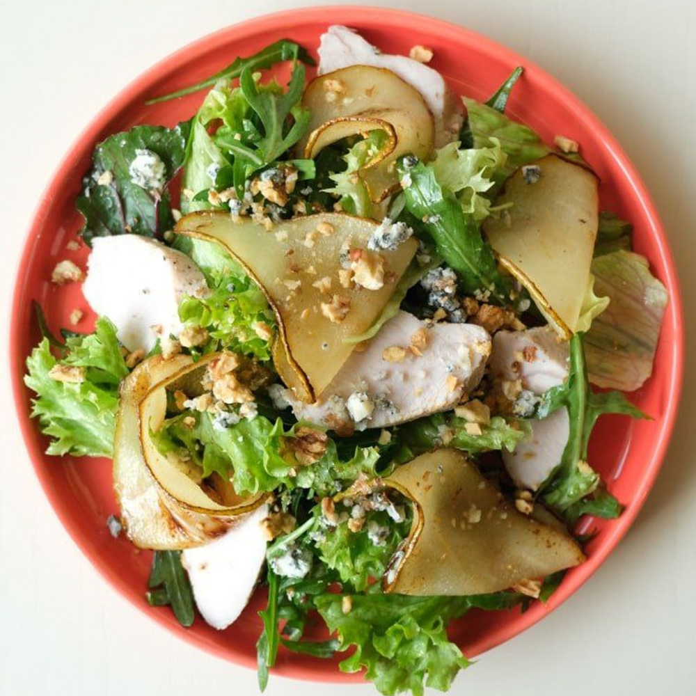 Микс зелени, индейка су-вид, карамелизированная груша, сыр дор блю, грецкий орех и медово-горчичный соус.