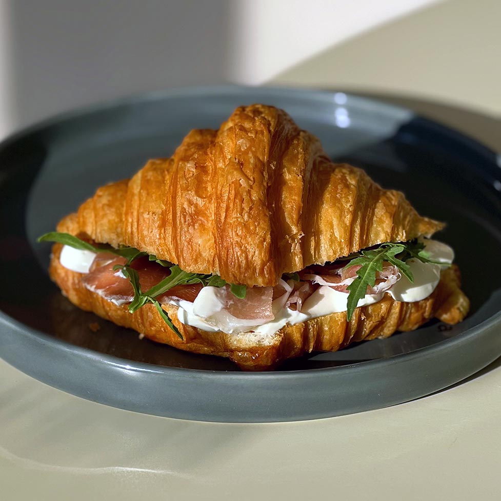 Круассаны с несладкими начинками подаем с крем-чизом и свежей рукколой