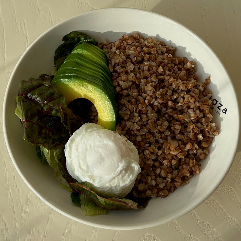 рассыпчатая гречка с яйцом пашот, свежим авокадо и зеленью